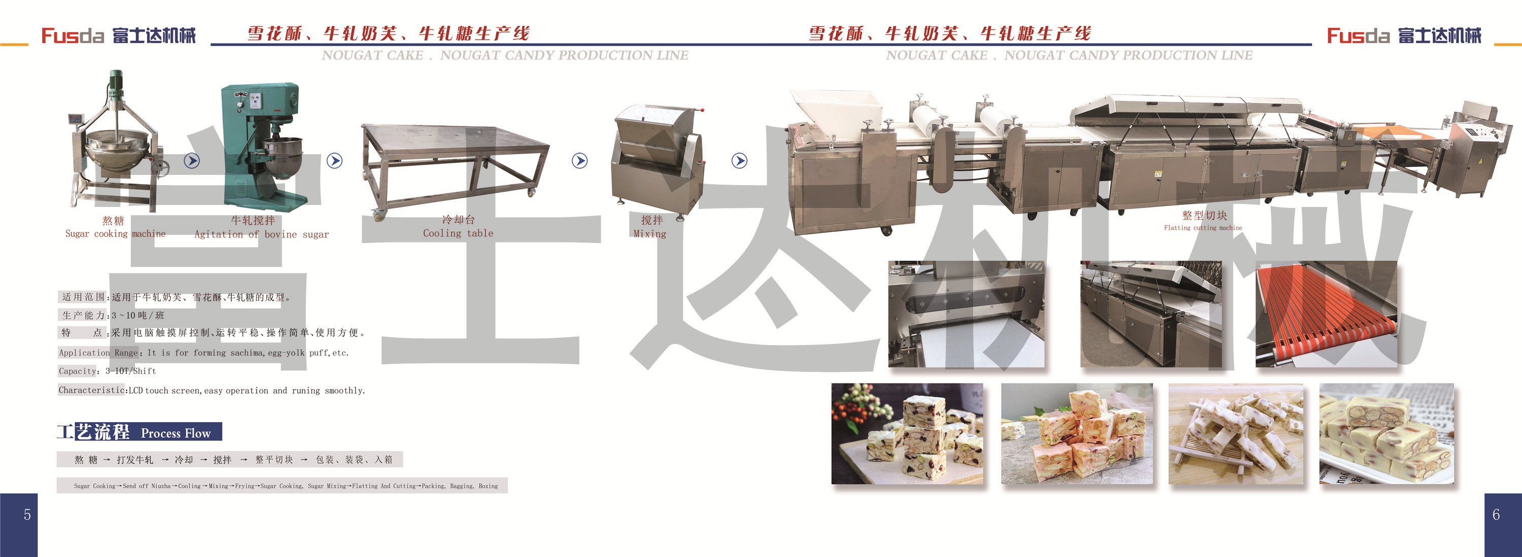 工藝流程:熬糖→打發牛軋→冷卻→攪拌→整平切塊→包裝,裝袋,入箱