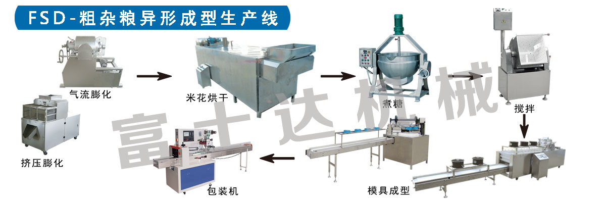 工藝流程:膨化造?!娓?油炸→煮糖→拌糖→整平切塊→包裝→入袋裝箱